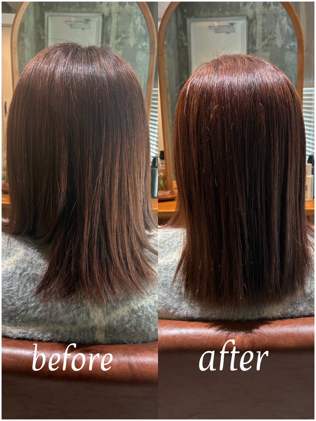 お仕上がりは、気にされていた赤みが消え、毛先までしっとりと落ち着く艶髪になりました。 写真でもわかる通り、光が滑らかに反射し、手触りも見た目も瑞々しい質感に復活しています。