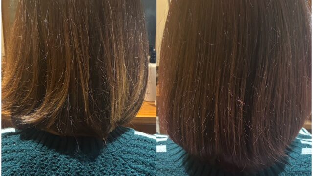 【原因】 原因は、繰り返しのカラーダメージによって髪の内部の栄養分が不足し、水分を保持する力が弱まっていたことでした。それによりキューティクルが乱れ、光を綺麗に反射できない状態になっていました。